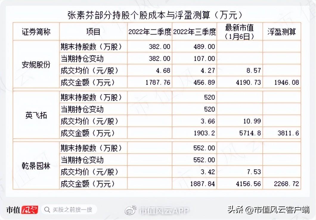张素芬在2022年二季度、三季度建仓的安妮股份、英飞特、乾景园林等在2022年四季度或2023年1月上旬出现较大涨幅,若按2023年1月6日收盘价计算,其账面浮盈非常可观。