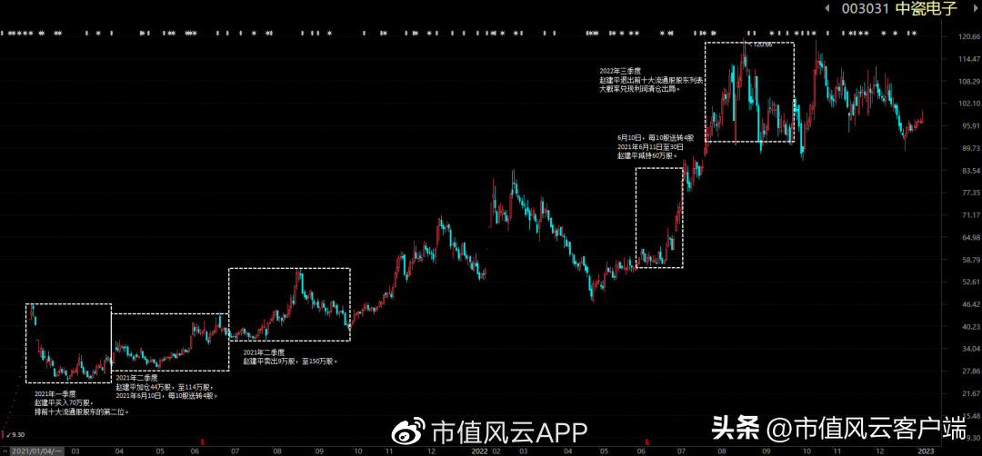 中瓷电子2021年1月上市,赵建平的持仓也比较早,一季度就建仓70万股,排在前十大流通股股东的第二位;二季度继续加仓89万股,随后锁仓到2022年三季度才卖出。