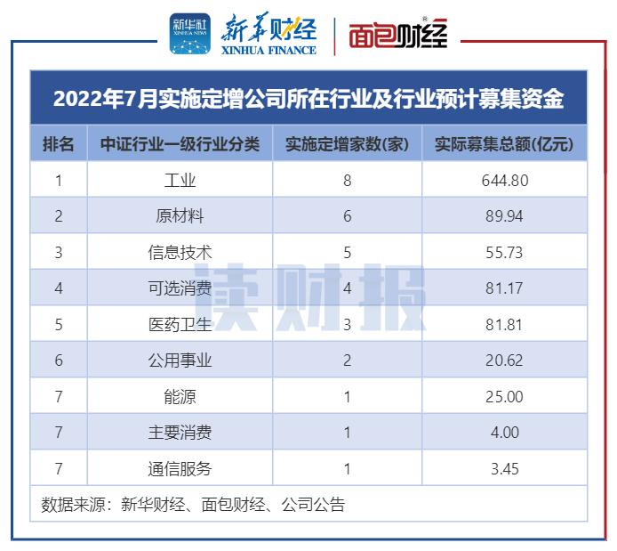 从行业分布来看,以中证行业统计,2022年7月,工业行业有8家上市公司实施定增,排在各行业之首;其次是原材料行业,有6家上市公司实施定增;信息技术行业有5家上市公司实施定增,排在第三位。