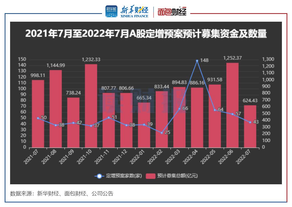 按照首日披露预案日口径统计,7月A股上市公司定增预案发布数量共计43家,环比减少14家,预计募资规模较上月减少50.14%。
