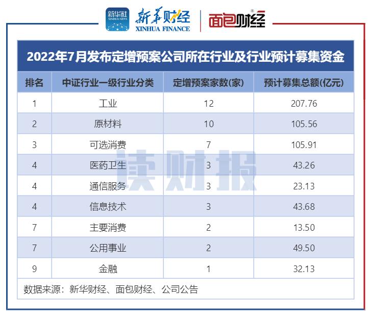 从行业分布来看,以中证行业统计,2022年7月,工业有12家公司发布定增预案,数量排在各行业之首;原材料行业排在第二位,有10家公司发布定增预案;可选消费行业有7家发布定增预案,位列第三位。医药卫生、通信服务和信息技术行业均有3家发布定增预案。