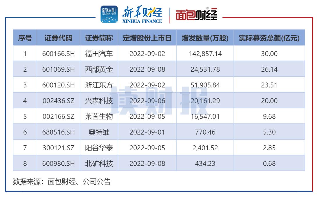 根据信披数据,以定增股份上市日统计,9月上旬A股上市公司共计实施定增8起,实际募集资金合计118.16亿元。