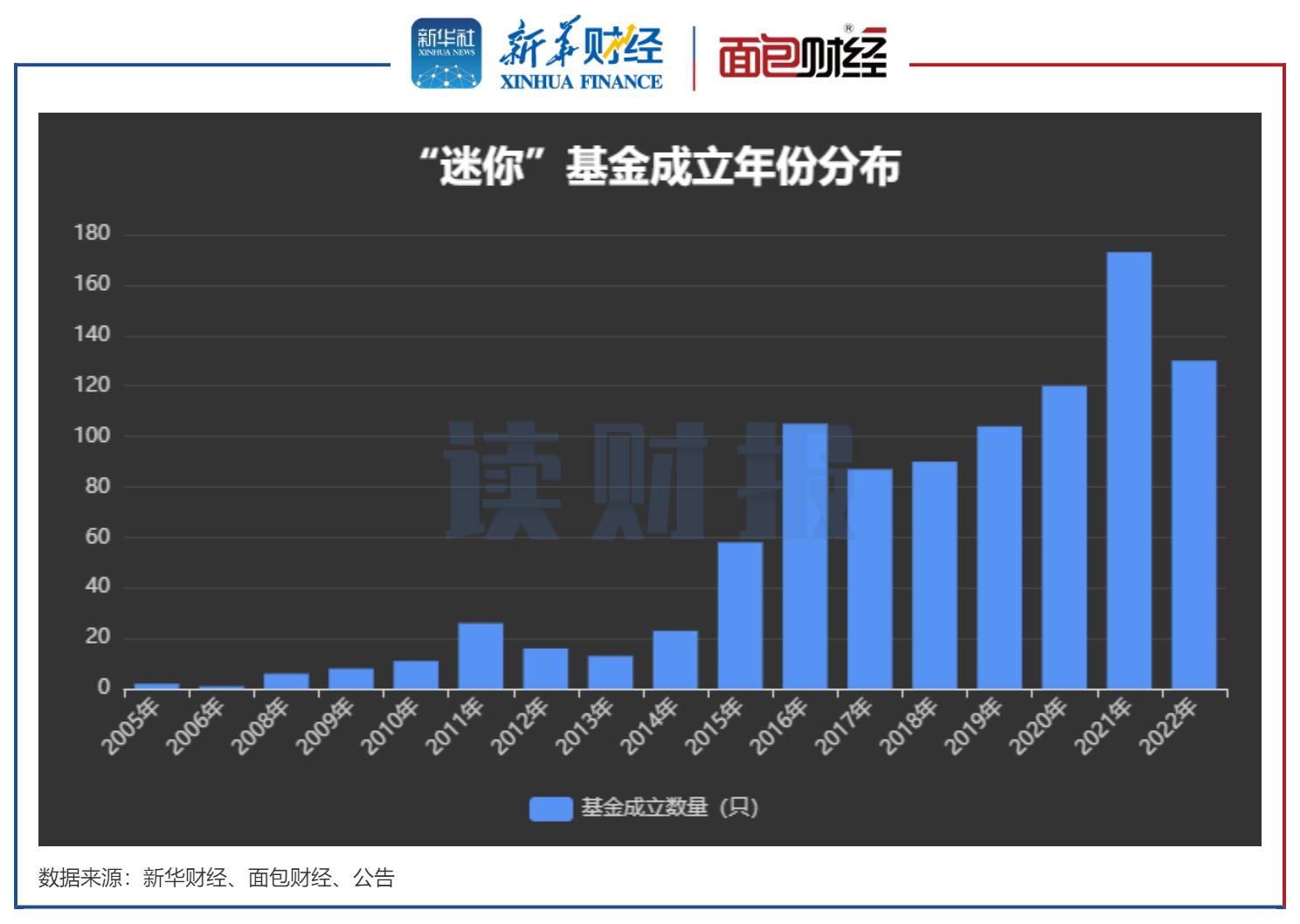 从973只“迷你”基金的成立年份分布来看,2021年成立的数量最多,达到173只。此外,2016年、2019年、2020年成立的“迷你”基金数量也均超100只。