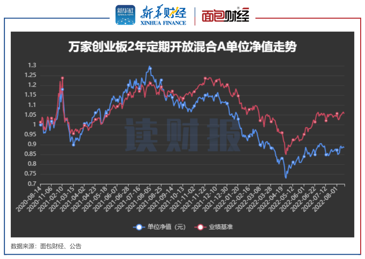 截至2022年8月12日,万家创业板2年定期开放混合A的单位净值为0.8844元,成立以来回报率-11.56%,且大幅跑输业绩基准。