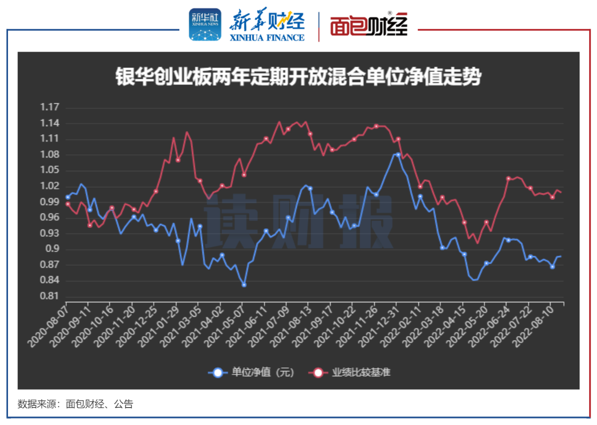截至2022年8月12日,银华创业板两年定期开放混合的单位净值为0.8871元,在创业板战略配售基金中单位净值较低。该基金成立以来回报率约-11.29%,跑输基准逾10个百分点,目前仍处于亏损状态。