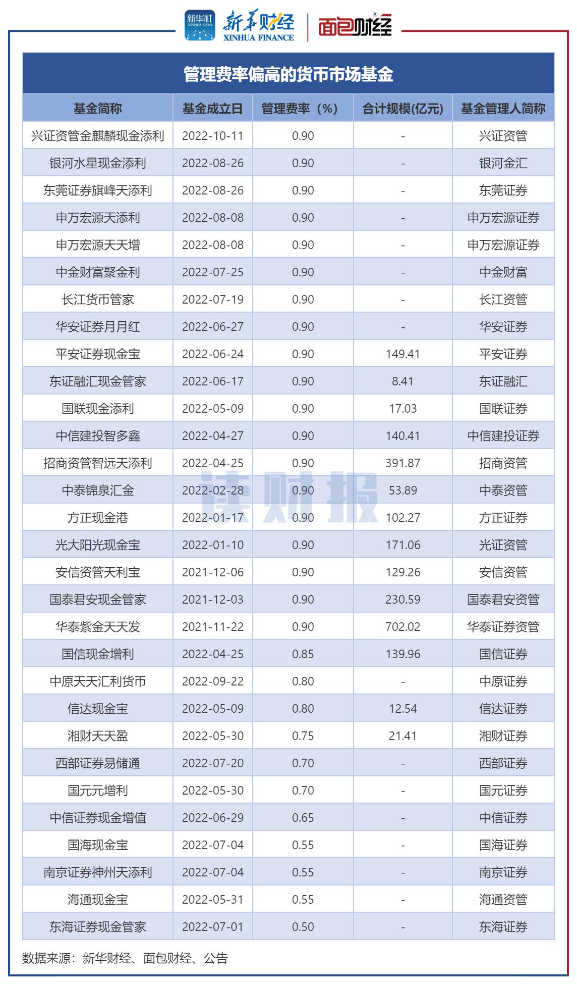 当前存续的公募货基中,有30多只货基的管理费率达到或高于0.5%,成立时间均在一年以内。其中,有19只货基的管理费率达到最高档0.9%,高出同类平均值2倍以上。