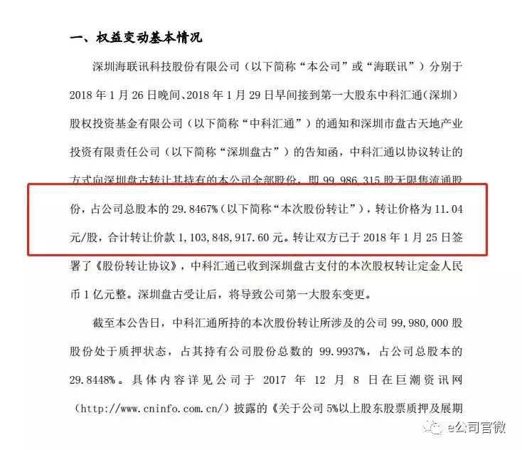 1月30日晚间,海联讯公告,第一大股东中科汇通向盘古天地产业协议转让所持全部29.85%股份,转让价格为11.04元/股,合计价款11.04亿元。双方已于1月25日签署了《股份转让协议》,中科汇通已收到深圳盘古支付的定金1亿元。该交易完成后,深圳盘古将成为海联讯第一大股东,中科招商的全资子公司中科汇通不再持股。