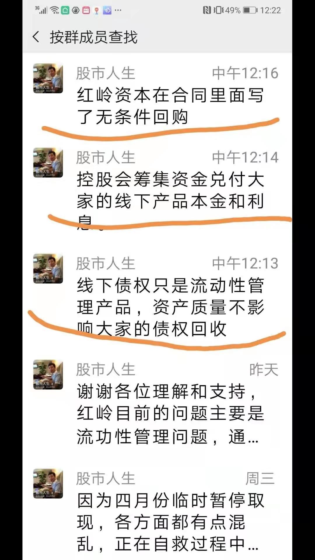 根据上述红岭资本核心出借人提供的群聊天截图显示,2019年5月,周世平在红岭资本官方微信群中表示,“线下债券只是流动性管理产品,资产质量不影响大家的债权回收。”周世平在当时的群聊中表示,红岭目前的问题主要是流动性管理问题。