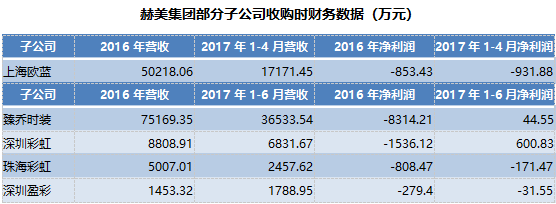 在2017年年报中,赫美集团并未分列出各子公司具体业绩情况,只披露服装行业毛利率高达46.37%,未披露净利率及相关子公司净利润。不过收购公告数据已足以证明。