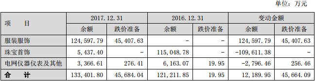 以下这组数据更直观:2017年赫美集团库存商品账面余额为13.34亿元,跌价准备4.57亿元,跌价准备较期初激增2289倍。增量主要是服装库存,服装库存12.46亿元,跌价准备4.54亿元。