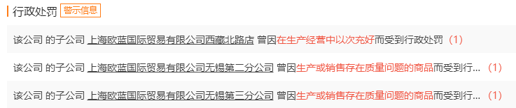 上海欧蓝无锡第二分公司、无锡第三分公司均曾因“产品质量低劣、危害人身财产安全”而被无锡市梁溪区市场监督管理局崇安寺分局处以罚款1.08万元和0.99万元,没收违法所得和非法财物。