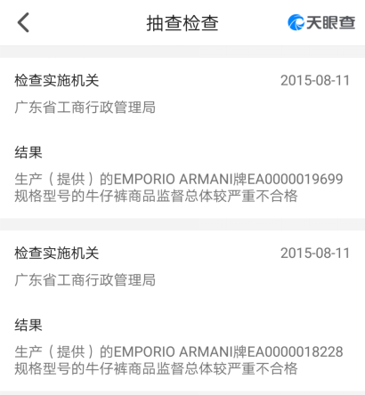 天眼查资料显示,2015年8月11日广东省工商行政管理局抽查结果显示,由臻乔时装生产(提供)的EMPORIO ARMANI牌EA0000019699规格型号和EMPORIO ARMANI牌EA00000118228规格型号的牛仔裤商品监督总体较严重不合格。