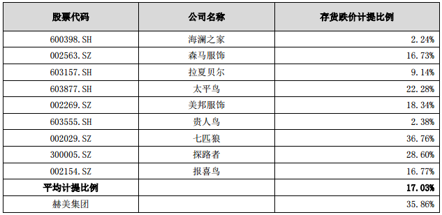 从服装类上市公司对比可以发现,赫美集团存货跌价计提比例35.86%,远高于同行业17.03%的平均水平,与七匹狼(002029.SZ)一同成为存货计提比例第一梯队公司。