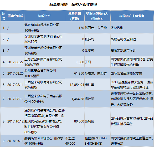 新收购的业务,聚焦在高端零售消费领域。2017年,赫美集团先后8次披露购买子公司股权,加上2018年对赫美尚品尚未完成的交易,共9次购买资产,具体如下。