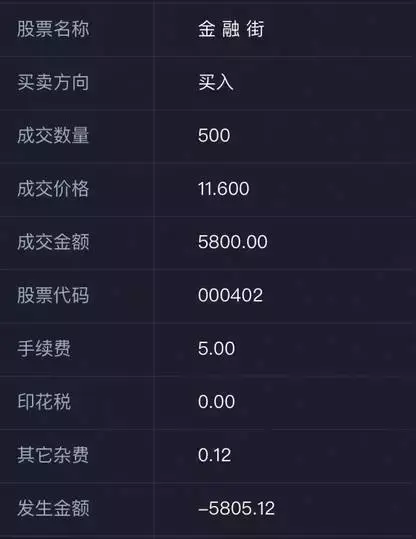 上图为买入“金融街”股票的交割单。成交额为5800,我们来验证以下买入成本明细吧。