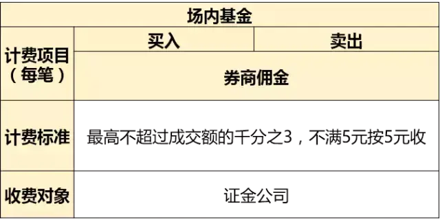 看过了股票收费的疯狂,相比较而言场内基金的交易手续费就要温和很多了。虽然场内基金在二级市场可以同股票一样被交易,但并不需要收取过户费和印花说,只是收取券商佣金。甚至有一些券商取消了每笔佣金最低5元的限制。以下是基金手续费明细表: