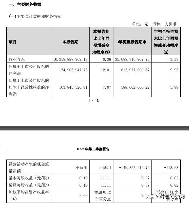 10月31日,中国黄金公告,2022年前三季度营收356.90亿元,同比微降3.33%;净利润6.14亿元,同比增长9.95%。虽收入有所下滑,但盈利能力仍强劲。其中第三季度,中国黄金实现营收103.6亿元,同比增长0.38%;净利润1.75亿元,同比增长12.01%。