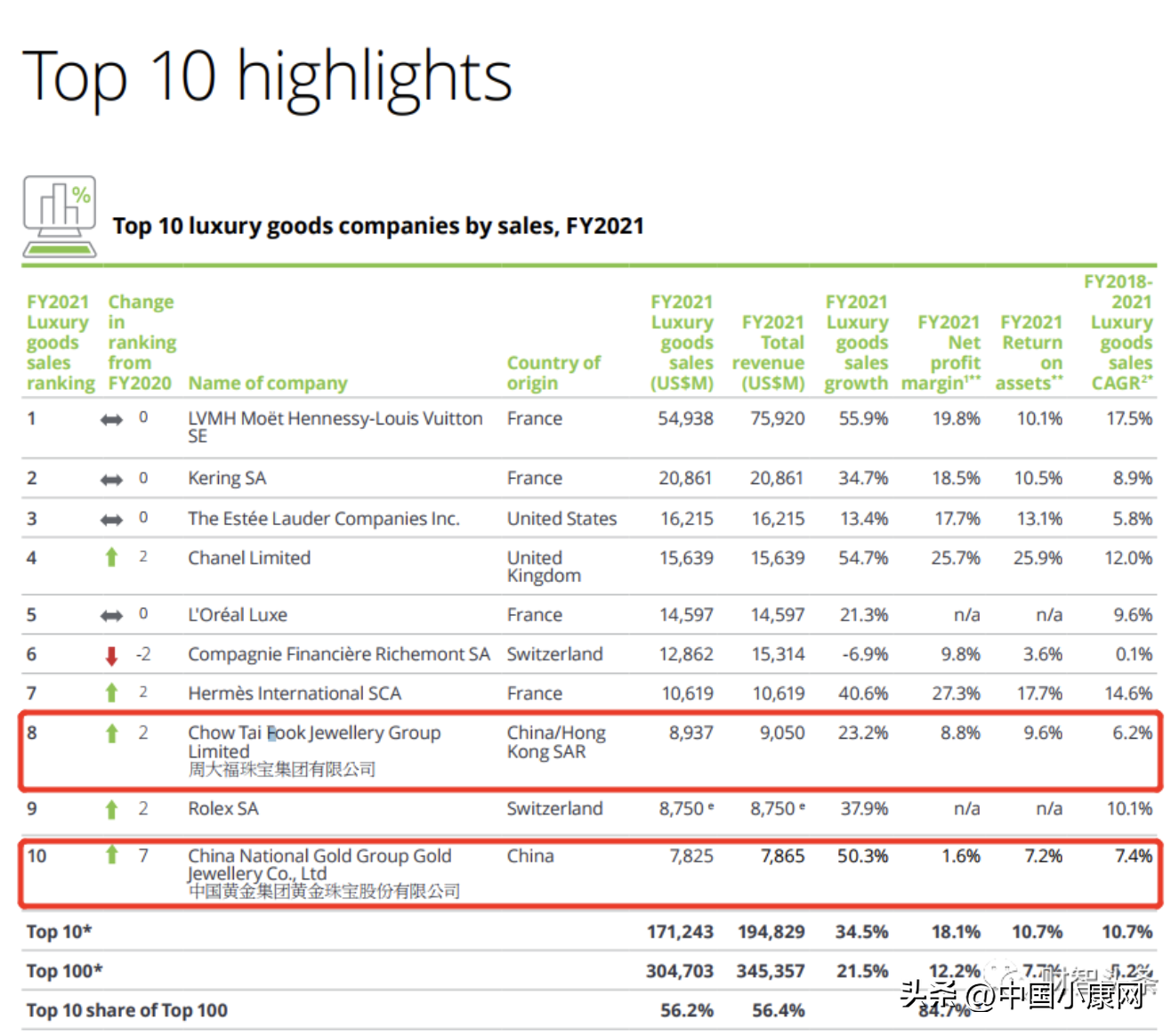 根据德勤(Deloitte)近期发布的最新《2022年全球奢侈品力量》(Global Powers of Luxury Goods 2022)报告,周大福和中国黄金成为唯二进入全球十大奢侈品公司行列的中国企业,排名低于LVMH、开云、雅诗兰黛和香奈儿。值得注意的是,周大福、中国黄金的排名分别上升了2位和7位。