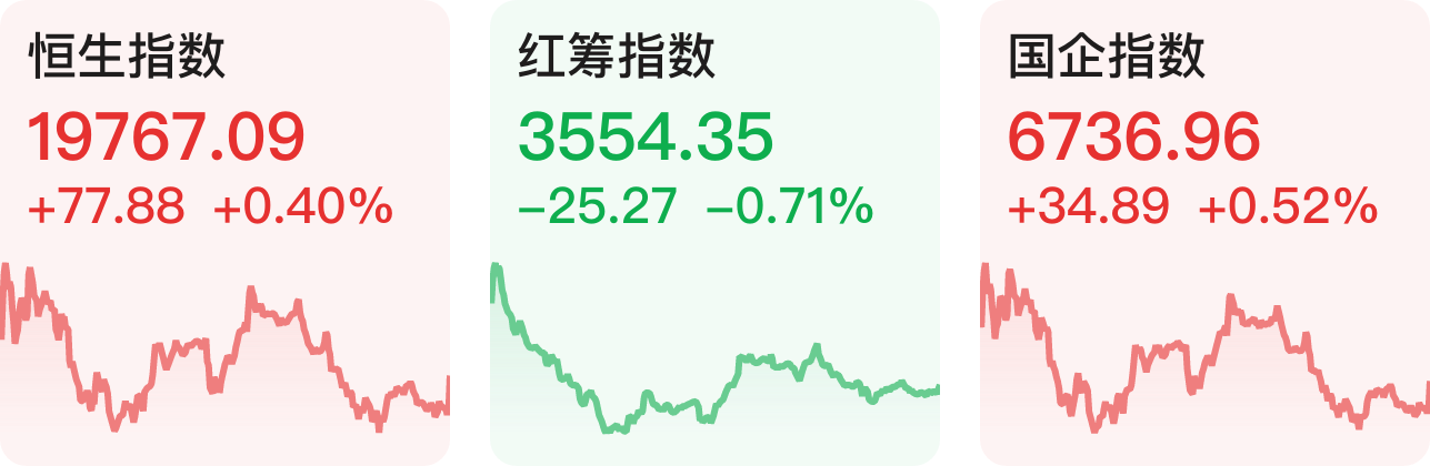 恒指收涨0.4%,恒生科技指数涨1.24%。科技、芯片、军工股涨幅居前,阿里巴巴涨近4%,万国数据涨超7%。大消费、地产、黄金股走弱,中升控股跌近5%。