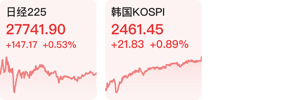 日经225指数涨0.53%,韩国KOSPI指数涨0.89%。