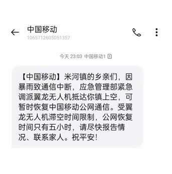 就这样,7月21日晚间,不少在河南米河镇的手机用户收到了一条又暖又燃的短信:
