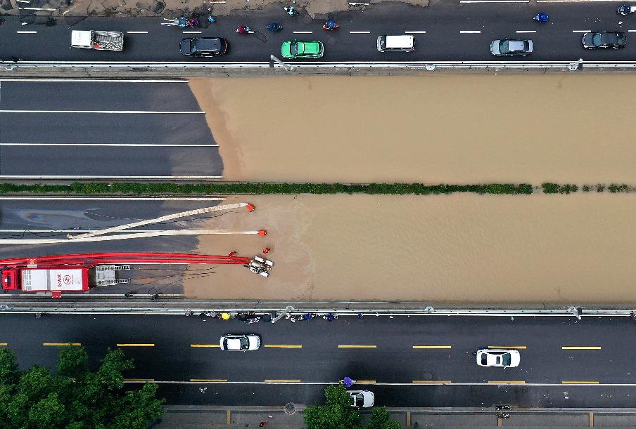7月22日,来自江西的救援人员在郑州市京广南路隧道进行排涝作业(无人机照片)。新华社记者 李安 摄