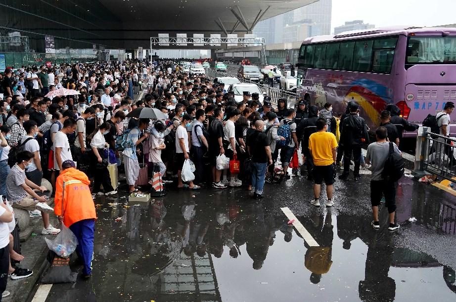 7月21日上午,郑州东站候车大厅内滞留旅客已明显减少,工作人员在进站口处组织旅客登乘大巴车,并提供食品。新华社记者 李安 摄