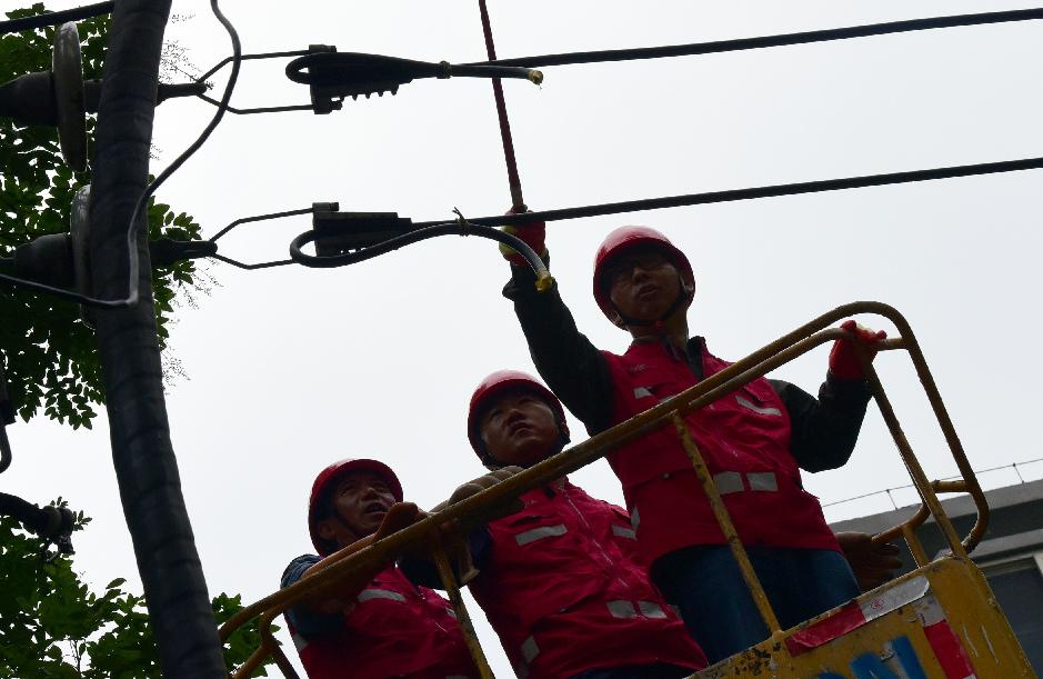 7月22日,电力班组人员在郑州市政六街抢修电力设施。 新华社记者 朱祥 摄