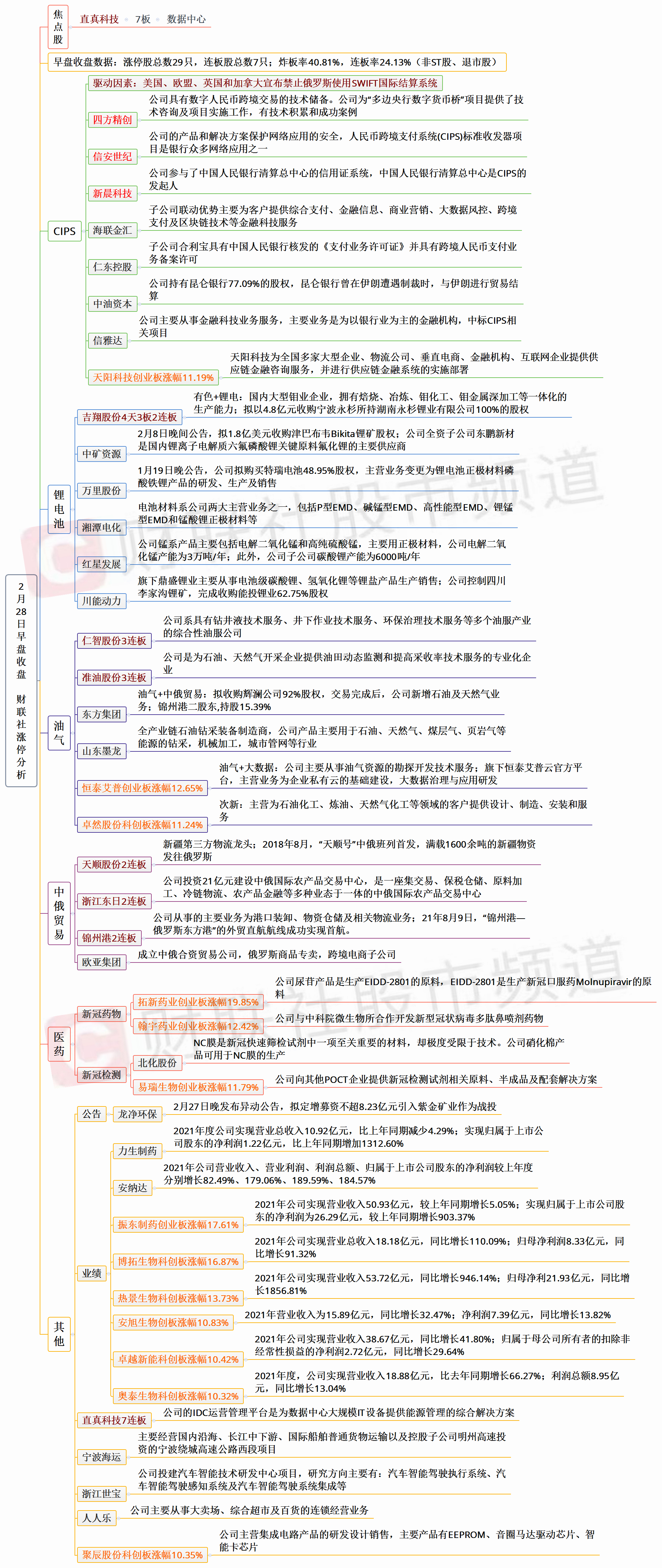 总之,早盘亮点在于油气和贵金属板块,受俄乌冲突影响,油价和黄金价格持续走强,有观点指出,俄乌冲突对全球市场的影响主要集中在对全球供应链和大宗商品的冲击上,且海外经济体通胀问题或将进一步恶化。数字货币板块也大幅走高,消息面,截至目前,已有110多个国家和地区在不同程度上开展了央行数字货币相关工作。此外,多国宣布禁止俄罗斯使用SWIFT系统,分析认为,中俄有望加快建立美元之外的本币结算体系,推动人民币国际化进程。此外,盐湖提锂、钴、煤炭等板块也盘中走高。跌幅榜上,基建、家电、工业母机、教育等板块跌幅居前,前期活跃的旅游、农机板块继续回落。高位人气股方面,直真科技成功晋级7连板,此前6连板的美利云今日仅小幅涨超1%。