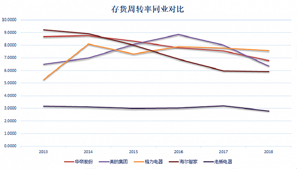 如下图所示:老板电器的存货周转率约在3倍水平,而格力、美的、华帝等存货周转率在7倍-9倍之间。
