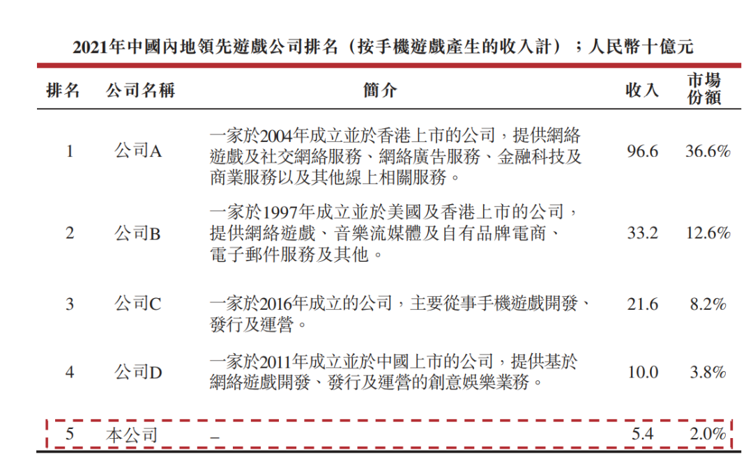 按收入计,于2021年,公司是中国第五大移动游戏产品营销及运营平台。
