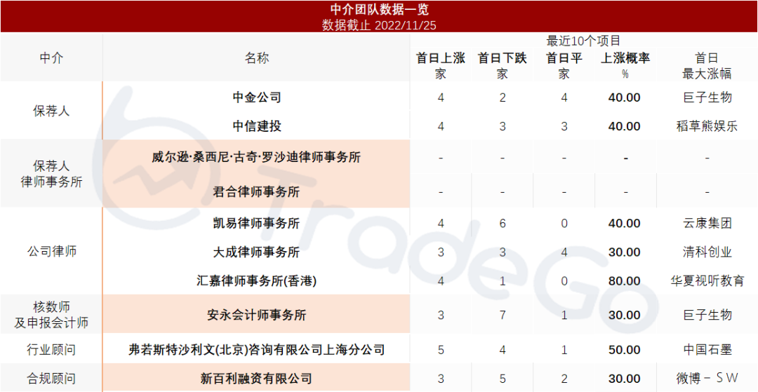 据捷利交易宝数据统计,中旭未来中介团队共计10家,其中保荐人共计2家,近10家保荐项目数据表现较好;公司律师共计3家,综合项目数据较好。整体而言中介团队历史数据表现较好。