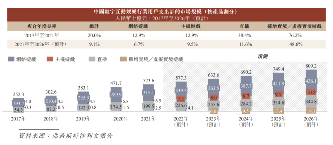 目前,网络游戏产品占中国数字互动娱乐行业最大的板块,按用户支出计,占 2021年中国数字互动娱乐行业总量的约60.2%。中国数字互动娱乐行业的市场规模以用户支 出计从 2017年的人民币2,523亿元增长至2021年的人民币5,236亿元,复合年增长率为20.0%, 并预计2026年将达到人民币8,092亿元,2021年至2026年的复合年增长率为9.1%。