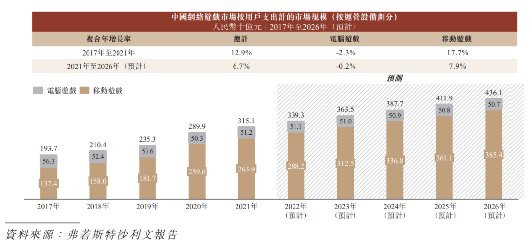 按用户支出计,中国网络 游戏市场的市场规模由2017年的人民币1,937亿元增加至2021年的人民币3,151亿元,复合年 增长率为12.9%,并预期将于2026年达至人民币4,361亿元,2021年至2026年的复合年增长率 为6.7%。按用户支出计,移动游戏于2021年占网络游戏市场的83.8%。