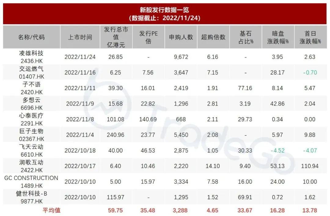 暗盘及首日收益率上,10月初,艾美疫苗首日微涨,中创新航收平,健世科技及GC CONSTRUCTION表现尚可;10月中旬,润歌互动暗盘及首日大涨,又是一家小市值公司黑马,紧随其后的元宇宙第一股 飞天云动暗盘及首日均跌超4%;11月初,巨子生物这位吸金兽暗盘及首日表现较为不错,紧接着心泰医疗暗盘及首日几乎走平,多想云暗盘大涨,首日高开低走,收涨2.04%;双十一,子不语做为跨境电商首日上市表现相当夸张,日内振幅约51.61%;11月中旬,交运燃气不负众望,暗盘强势上涨28.17%,但首日变脸,最后微跌;11月下旬,凌雄科技暗盘及首日均略涨。截至目前,暗盘涨跌整体均值约为16.28%,而首日约为13.78%。