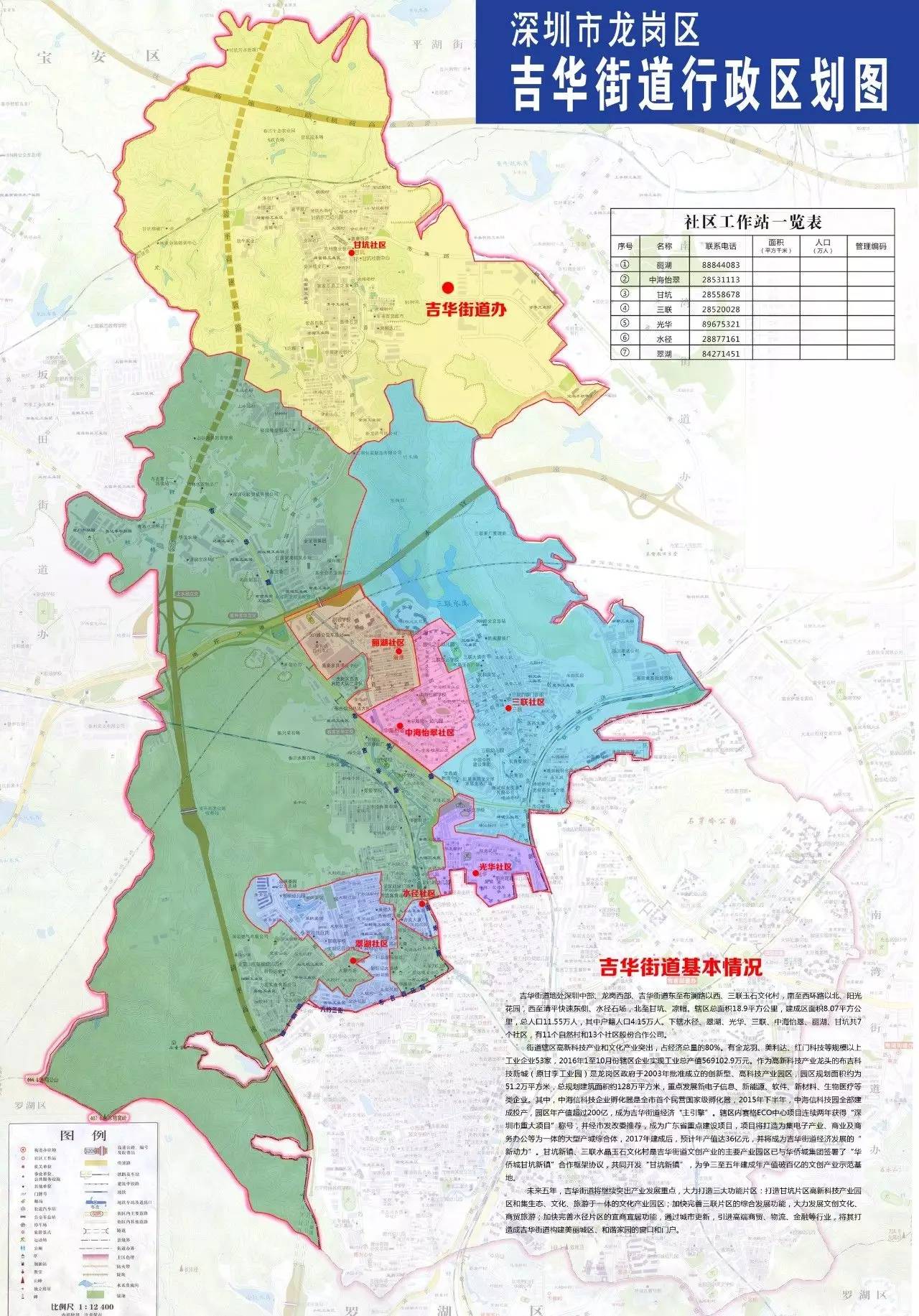 吉华街道地处深圳中部、龙岗西部,东至布澜路以西、三联玉石文化村,南至西环路以北、阳光花园,西至清平快速东侧、水径石场,北至甘坑、凉帽。辖区总面积18.9平方公里,建成区面积8.07平方公里,管理人口26.06万人,其中常住人口19.27万人,户籍人口3.46万人。下辖水径、翠湖、光华、三联、中海怡翠、丽湖、甘坑共7个社区,共有11个自然村和13个社区股份合作公司。