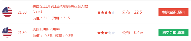 晚间21:30,美国公布当周初请失业金及10月PPI月率: