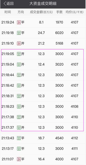 有意思的是,晚间21:17左右,短短2分钟内,白银大资金明细当中频繁出现3000手,单笔成交金额为1230万元的大单,开仓方向均为空开,主力资金背后目的到底是什么,有何玄机,值得揣摩!