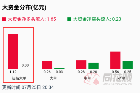 看点:从资金分布来看,各级别资金均出现活跃表现,其中大资金净多头流入1.65亿。