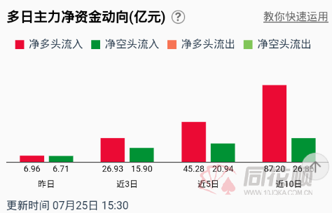 图中可以看出3日、5日、10日数据,多头资金全面压制空头。昨日多空资金相对均衡,多头净流入小幅领先。