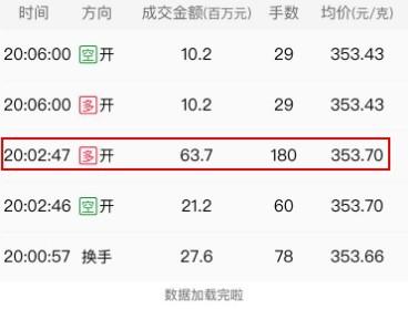 从大资金成交明细来看,黄金TD在20:02成交了一笔高达6370万元的大单,开仓方向为多开,成交价格为353.70元/克。