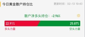 散户持仓数据显示,黄金散户净多头持仓-2.96%,较上个交易日的4.13%下降了7.09%,表明散户空头一方继续占优。