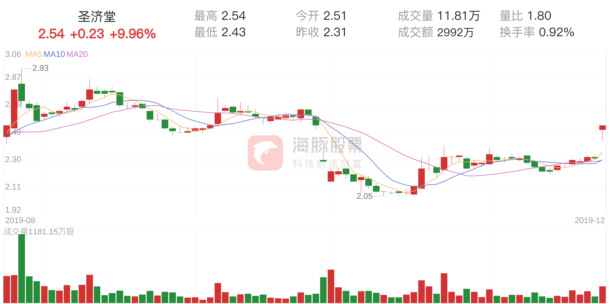 根据海豚股票数据统计显示,截至收盘,圣济堂股价报2.54元,涨跌幅为9.96%,换手率为0.92%,全天成交2992.32万元。