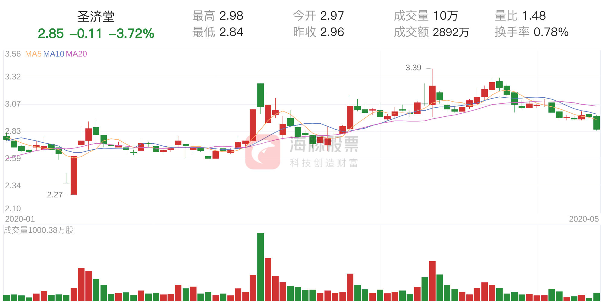 根据海豚股票数据统计显示,截至收盘,圣济堂股价报2.85元,涨跌幅为-3.72%,换手率为0.78%,全天成交2892万元。