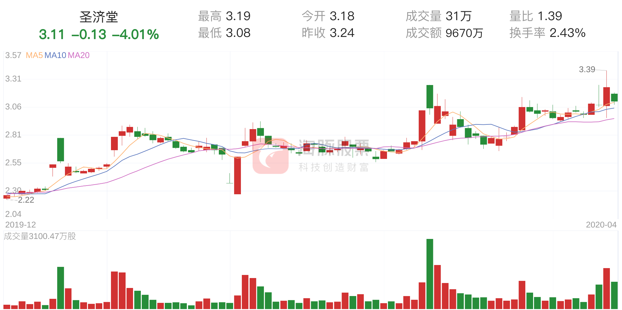 根据海豚股票数据统计显示,截至收盘,圣济堂股价报3.11元,涨跌幅为-4.01%,换手率为2.43%,全天成交9670万元。
