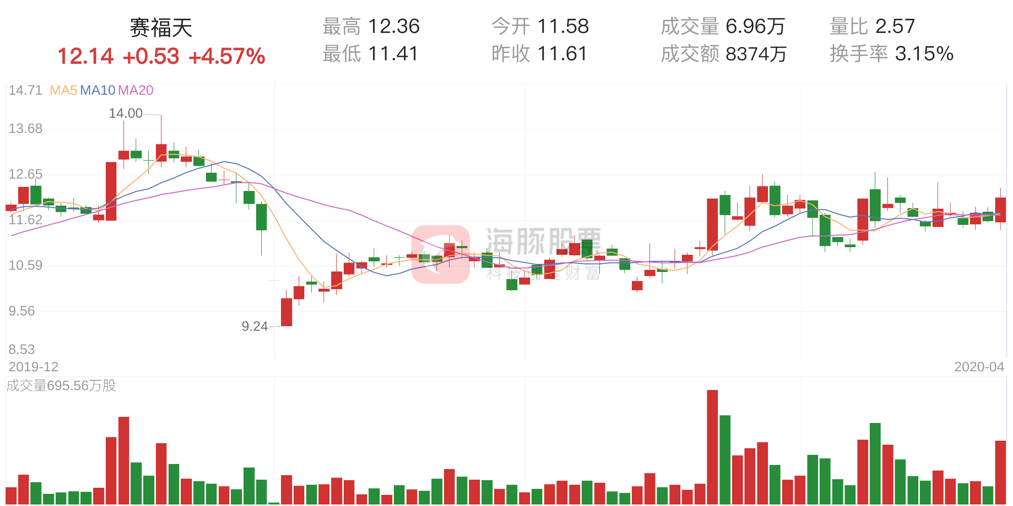 根据海豚股票数据统计显示,截至收盘,赛福天股价报12.14元,涨跌幅为4.57%,换手率为3.15%,全天成交8374万元。