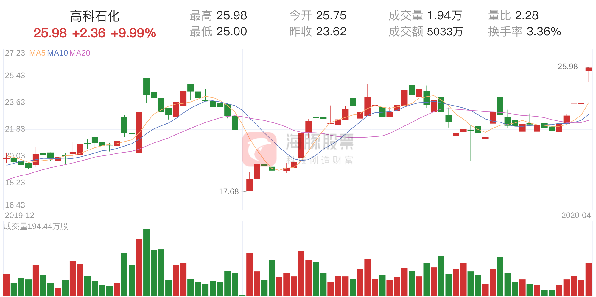 根据海豚股票数据统计显示,截至收盘,高科石化股价报25.98元,涨跌幅为9.99%,换手率为3.36%,全天成交5033万元。
