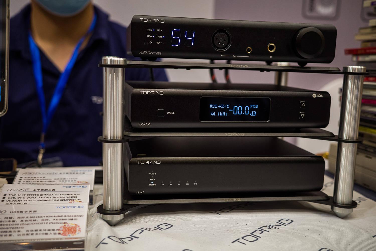 这些展台就不一一去说了,重点说几个,首先是拓品A90D耳放,这个耳放我之前晒过,是目前桌面的主力型号,搭配奥莱尔S8在用,驱动有源音箱和我手里的其他耳机,而且我给额外配了铜彩的电源线。A90D也许是拓品的一个转折点,因为我第一次在拓品身上感受到了一定的高频鲜活度,而之前的不论是套装、还是纯耳放、还是一体机,那股子浓浓的科HI味儿我是不喜欢的,素质确实是个个都不错。A90D这个耳放是我认为已经可以达到推荐级别的一款,推力够大,大到可以把我手里ZMF的VC封闭式推出很大的声场来,音色不干涩了,能够把K701的中频推出点甜味儿。我建议如果大家能够有心准备一个乐感更好的电源线、RCA or XLR线,或者接一个本身音色不错的解码,A90D的性价比可以得到极致的发挥。