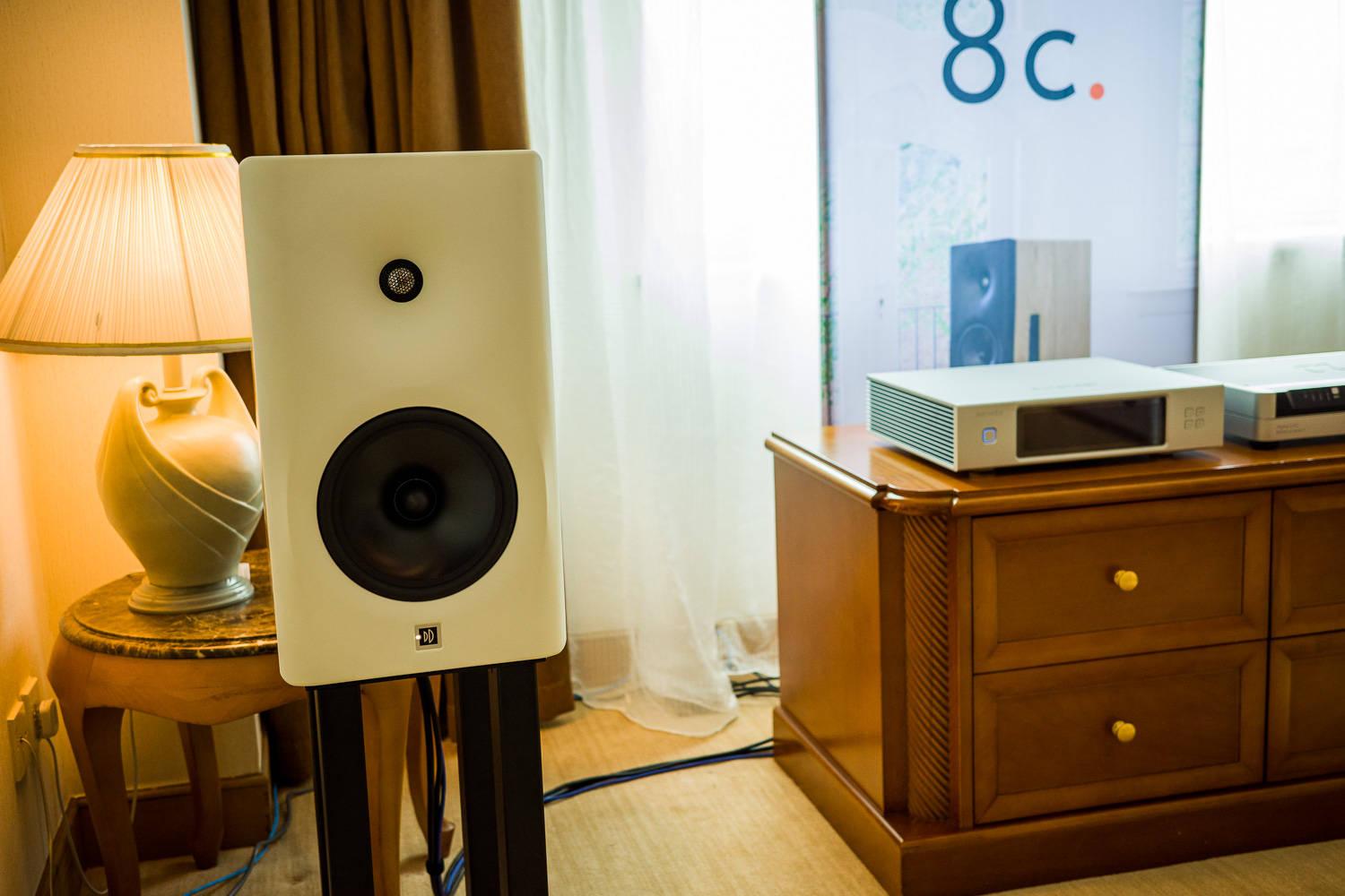 更让我感兴趣的是楼上523房间的荷兰Dutch&Dutch有源数字音响系统,售价11.3万,而且这个音箱还是自带解码的那种,它不仅是一个音箱,可以说完全就是个完整的音频系统。具有数字AES输入,XLR模拟信号输入和LAN网络连接,通过局域网络远程控制和设置。8c内置DAC、放大器和数字音频串流式传输器,还有DSP空间校正功能,是集合先进技术功能于一身的次时代音箱