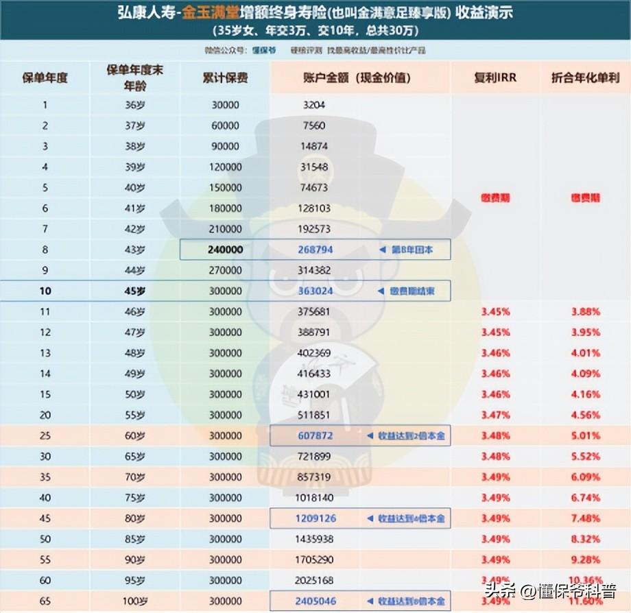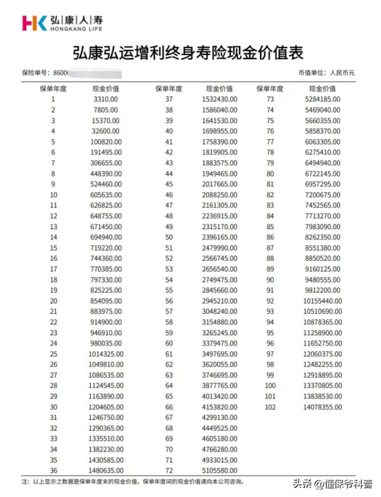 市面上的大部分增额寿是按照约等于3.5%的年化复利终身增值的。每一年的现金价值是多少都是明确写到合同里的,很清楚。